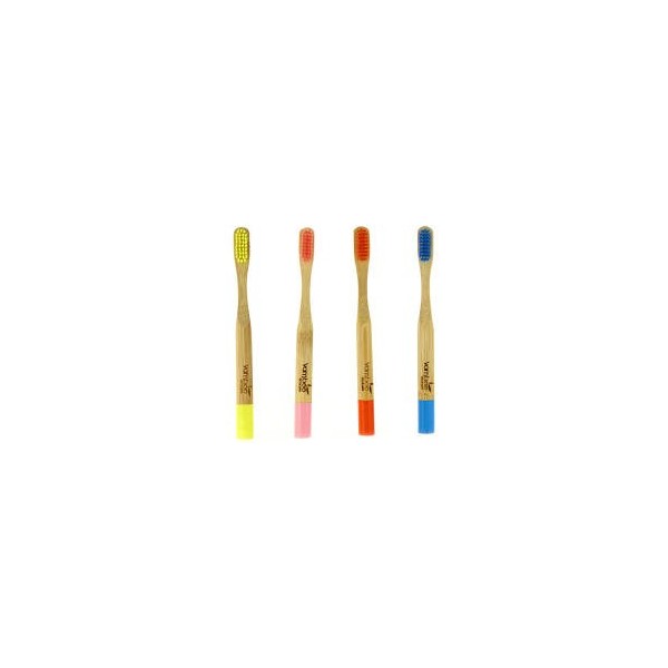 Los cepillos de dientes Vamboo están elaborados a base de bambú variedad moso y cerdas de nylon libres de BPA en diferentes durezas (suave y medio) y diferentes colores identificativos (Naranja, azul, rosa y amarillo).